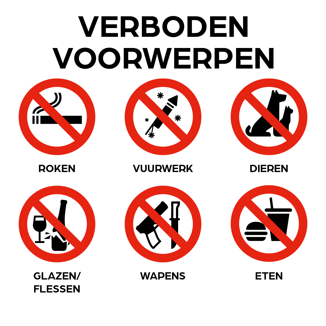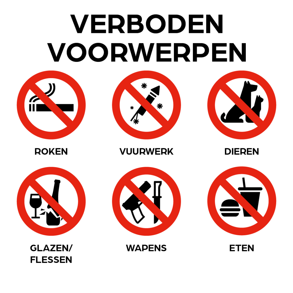 De organisator behoudt zich het recht voor om bezoekers van wie de tickets niet via de officiële verkoopkanalen zijn gekocht, de toegang tot het evenement te ontzeggen. Misbruik, vervalsing of fraude kunnen worden vervolgd. Wijzigingen in het programma leiden niet tot een volledige of gedeeltelijke terugbetaling van het ticket. Tickets mogen niet worden gebruikt voor commerciële of promotionele doeleinden, tenzij met schriftelijke toestemming van de organisator. De volgende voorwerpen zijn verboden (en zullen worden geweigerd bij de ingangen): scherpe voorwerpen, wapens, glas, blikjes, flessen (glas & plastic), professionele foto-, film- en opnameapparatuur, drank en voedsel, drugs, dieren (met uitzondering van blindengeleidehonden), vuurwerk en elk voorwerp dat een gevaar kan vormen voor de veiligheid. Bezoekers betreden het evenement op eigen risico. Door het evenemententerrein te betreden, gaat de bezoeker akkoord met mogelijke preventieve en controlemaatregelen, waaronder identiteits- en lichaamscontroles en fouillering van tassen. Bij niet-naleving van deze maatregelen kan de toegang tot het evenement worden ontzegd. Het is ten strengste verboden promotionele of commerciële activiteiten te ontplooien op en/of rond het evenemententerrein zonder voorafgaande schriftelijke toestemming van de organisator. De bezoeker is aansprakelijk voor alle schade die door zijn/haar toedoen of nalaten wordt toegebracht aan eigendommen en/of personen op het evenemententerrein en vrijwaart de organisator tegen aanspraken van derden ter zake. De organisator kan niet aansprakelijk worden gesteld voor schade, verlies of diefstal en eventuele ongevallen, tenzij er sprake is van opzet of grove nalatigheid. De organisator kan in geen geval aansprakelijk worden gesteld in geval van overmacht. Elke persoon die het evenemententerrein betreedt, gaat ermee akkoord dat hij/zij gefotografeerd en gefilmd kan worden en dat de beelden opgenomen en opgeslagen kunnen worden en gebruikt kunnen worden voor communicatie over het evenement en andere toekomstige (hockey) evenementen van de organisator.